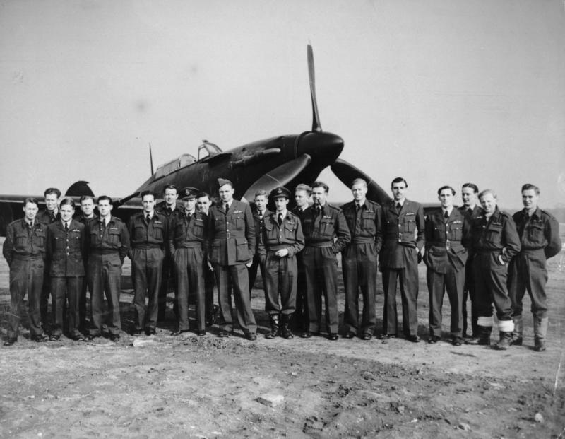 A group of No. 3 Squadron RAF, pilots standing in front of a Hawker Hurricane IIC at RAF Station Hunsdon.